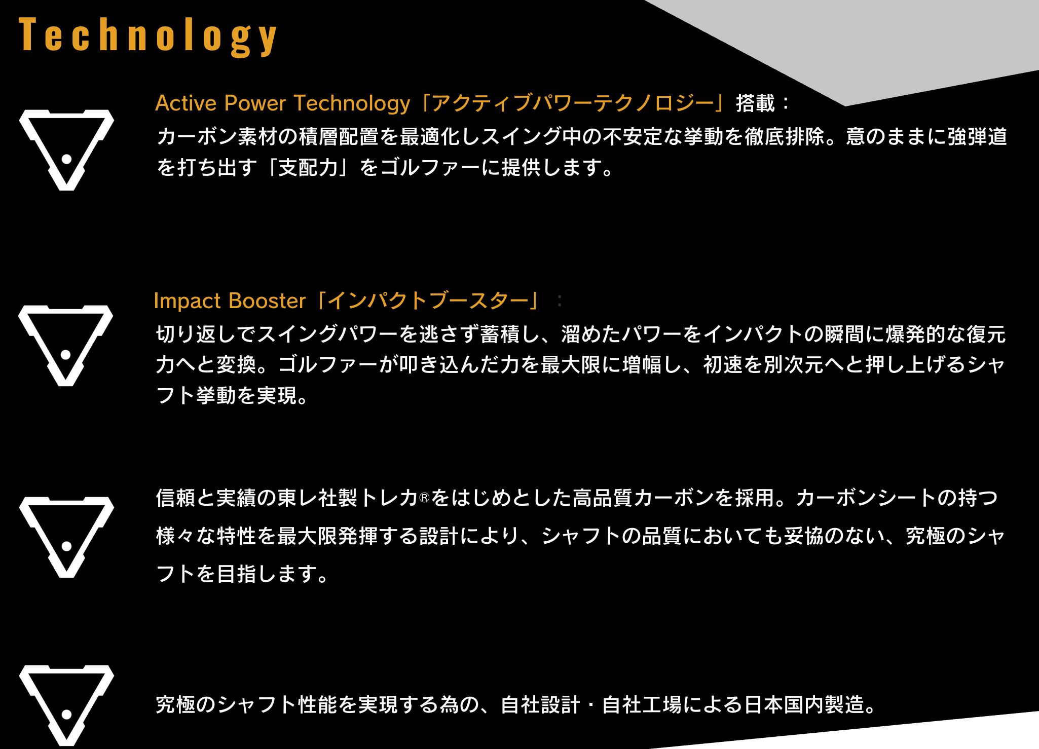 Blitzとは電撃戦。それはスイング力を意のままに制御するという「戦略性」を実体化させたシャフト。「Blitz / 稲妻」の名が示す通り、切り返しで蓄えたスイングエネルギーを、インパクトの瞬間にまるで稲妻が走るかの如く一気に開放しボールへと叩き込むことで、圧倒的な強弾道と飛距離を描き出す。「力を増加させ、意のままに叩く」自らの意志で飛距離を支配したい技巧派ゴルファーの要求を実現可能なシャフトです。